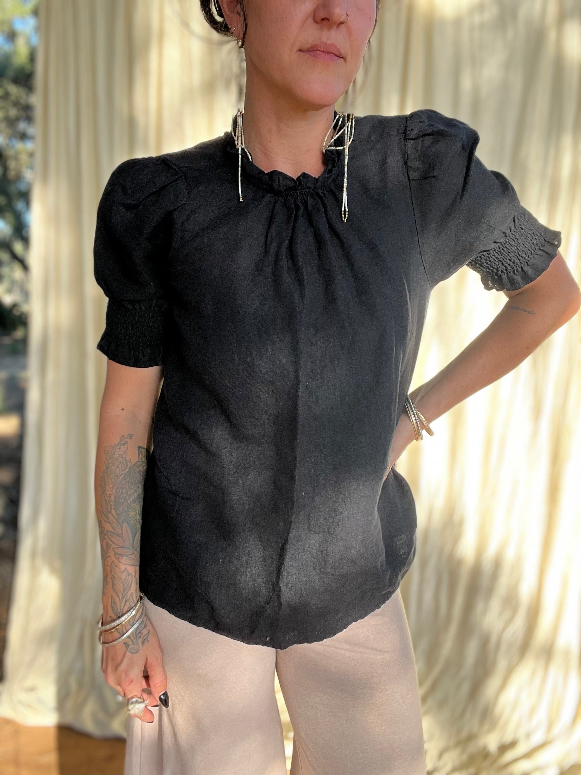 I can’t decide if I’m leaning more towards Victorian Gothic/Wednesday Adam’s vibes or Little House on the Prairie vibes….either way I love it. Crisp, classy black linen with exceptionally comfortable puff sleeves and a ruffled, gathered high neck. New without tags. Top notch quality.