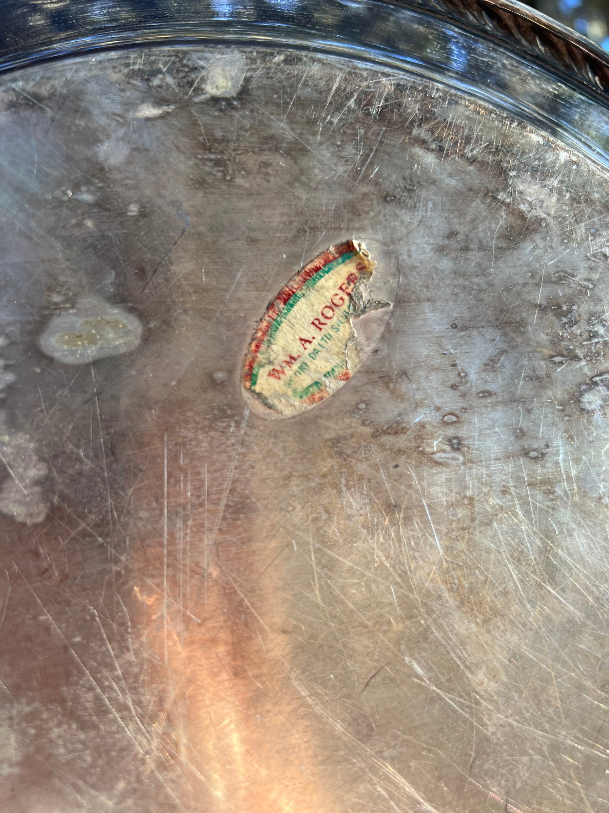 A beautiful silver platter with intricate flower motif, twisted rope border and a brilliant patina. It also still has the ORIGINAL WM Roger’s sticker on the bottom. I am happy to polish it up prior to shipping unless you would prefer to keep the patina- please leave a note if you would like it polished.