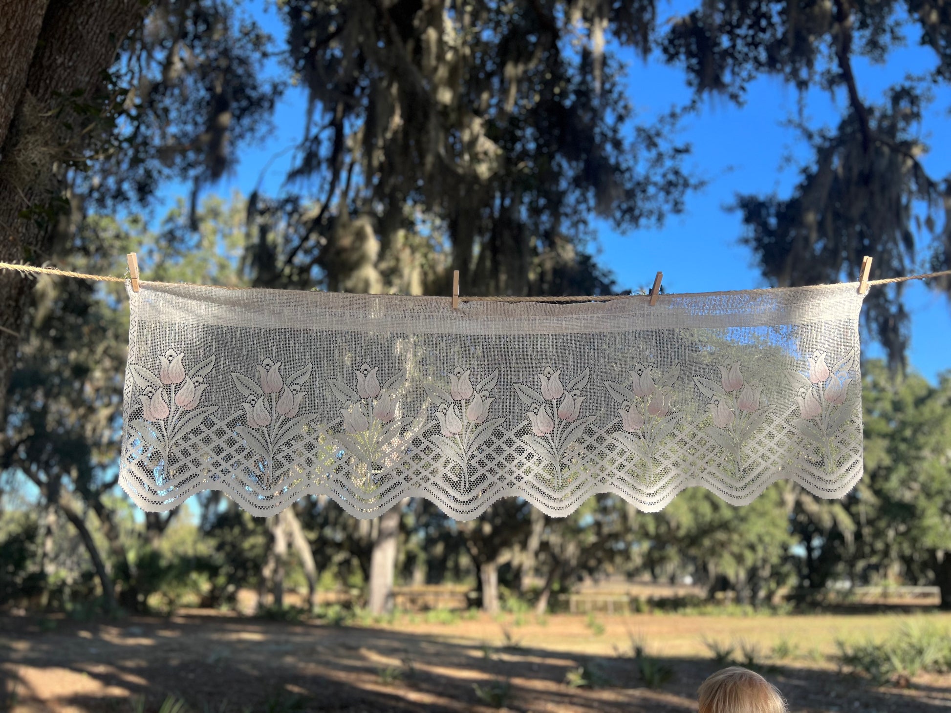 The most precious vintage lace curtains (two panels) with a tulip motif. They are off-white with the most subtle hint of color in the tulips. I’m dreaming of seeing these in a cottage kitchen window.